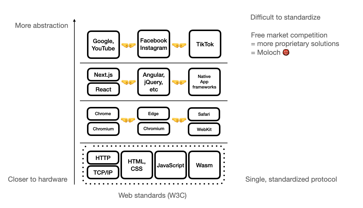 Because of this, technical stacks that are more fundamental and down the stack (i.e. closer to bare metal) tend to be standardized much quicker, easier, and change way less often – future applications will also probably built on top of them. Those are what become long-lasting protocols. On the other hand, technical stacks that are higher up – i.e. closer to what's user-facing and more abstracted – are subject to change a lot more often than those that are lower. A paradigm shift from text to video, for example, deprecated a lot of concepts of "hypertext" originally proposed with the Web; it took the W3C more than a decade to standardize what Flash and Java applets have been doing for more than 20 years with video and interactive content with HTML5, and those are not even that far up the stack. When things are this unstable and quickly changing, it is less likely for them to be a standardized protocol and more likely to be proprietary services, simply because free market competition is way more efficient to responding to changes and paradigm shifts than protocols that require a long time to reach consensus.